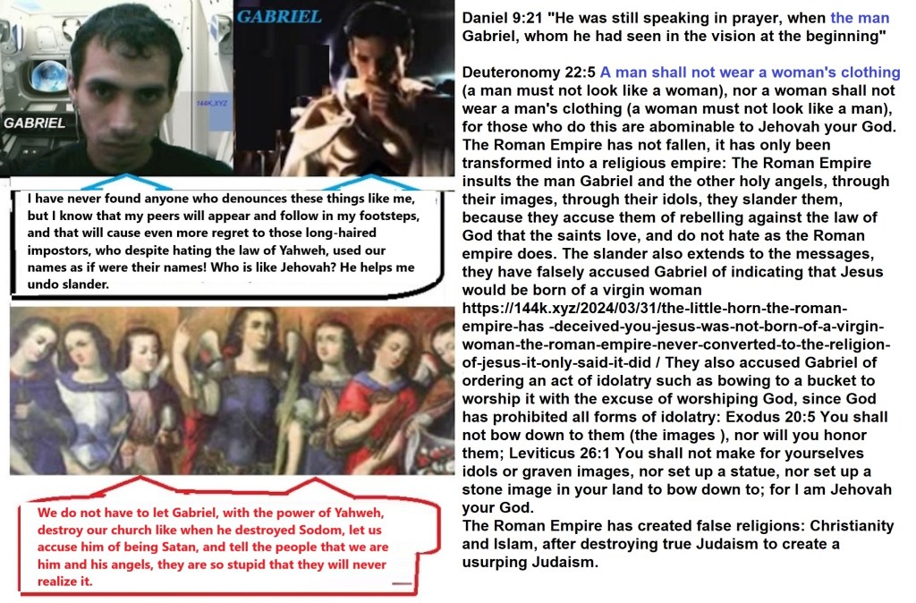 Stop your blasphemes! (Matthew 22:30). With your slander against the faithful messager and with your hatred for the law of Jehovah (Leviticus 11, Isaiah 65:4 , Leviticus 21:14, Isaiah 66:21), you insult, like those Greeks, who had you as their god (2 Maccabees 6:2), the blood of faithful Jews who died for love of the law of Jehovah (2 Maccabees 7, 2 Maccabees 6:18-20), I hate the enemies of Jehovah, they are my enemies too, and you will not be able to change my feelings against my enemies, I will take revenge (Psalms 139:17-22). What has been decided will be done (Psalms 18:37-50). If you are not Satan but me, Why are you preaching love to my enemy Satan?. I hate Satan because I love Jehovah. Jehovah’s enemies are also my enemies, and I hate them. Psalms 139:17-22. Your angels dress like those whom Jehovah hates, but my angels do not (Deuteronomy 22:5, Isaiah 3:9), Speaking of which: Why did those men who worship you always draw me without clothes?. Do your men like men? (Genesis 13:13, Genesis 19:4-29, Ezekiel 16:48-50 (Leviticus 18)).